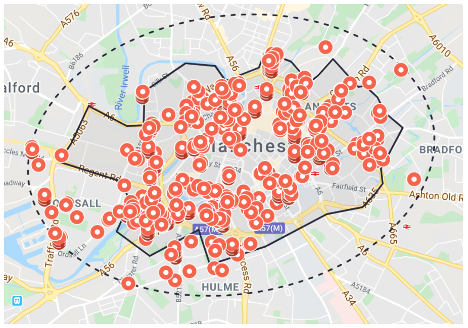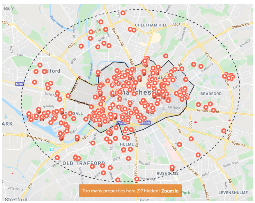 When we expand the search area to 1 mile (keeping the same search function as before), it returns 597 properties available for rent in the last 2 weeks. Furthermore, hotspot areas such as Salford Quays and Cornbrook now become visible, two locations with good transport links to the city centre and most-likely, very appealing to visitors. Due to the mass of properties available, the returning map was unable to visualise the full extent of the rental options.